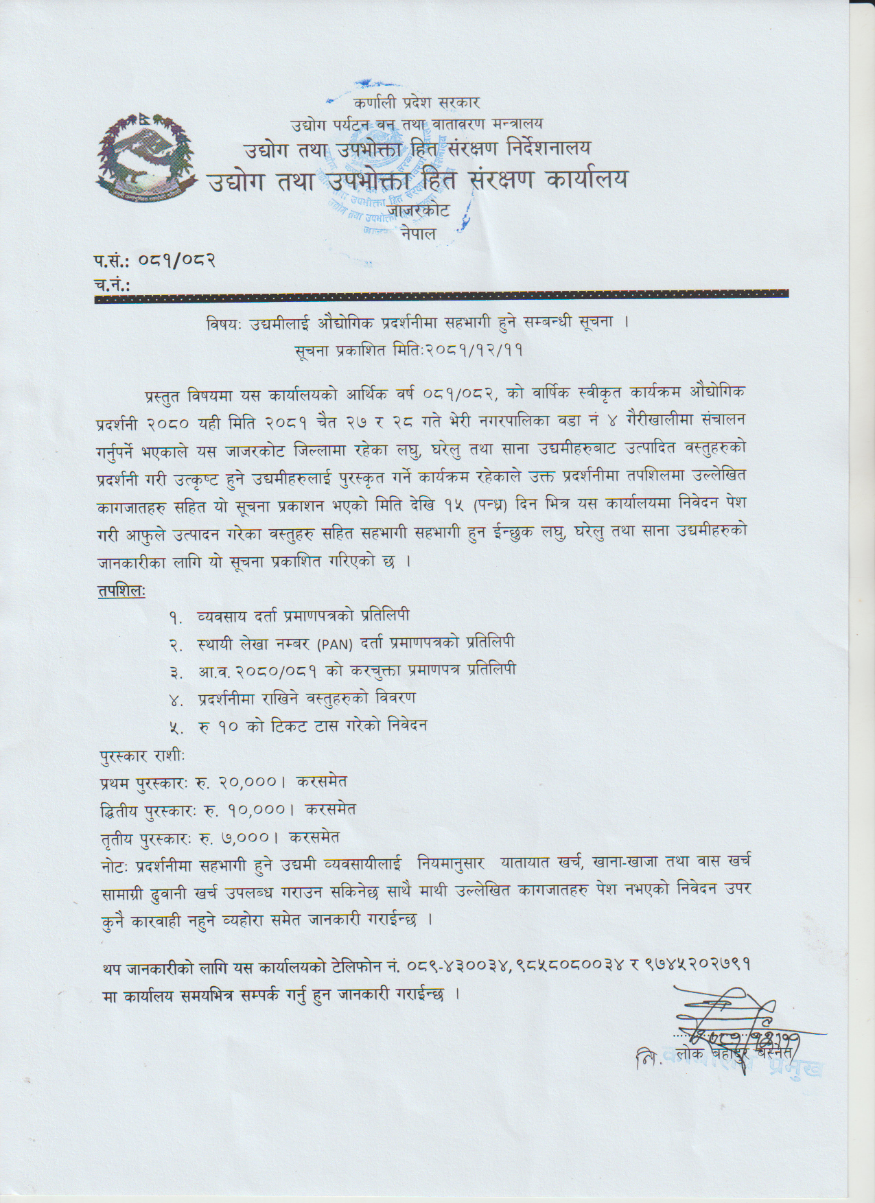 उद्यमीलाई औद्योगिक प्रदर्शनीमा सहभागी हुने सम्बन्धी सूचना 2081/12/11