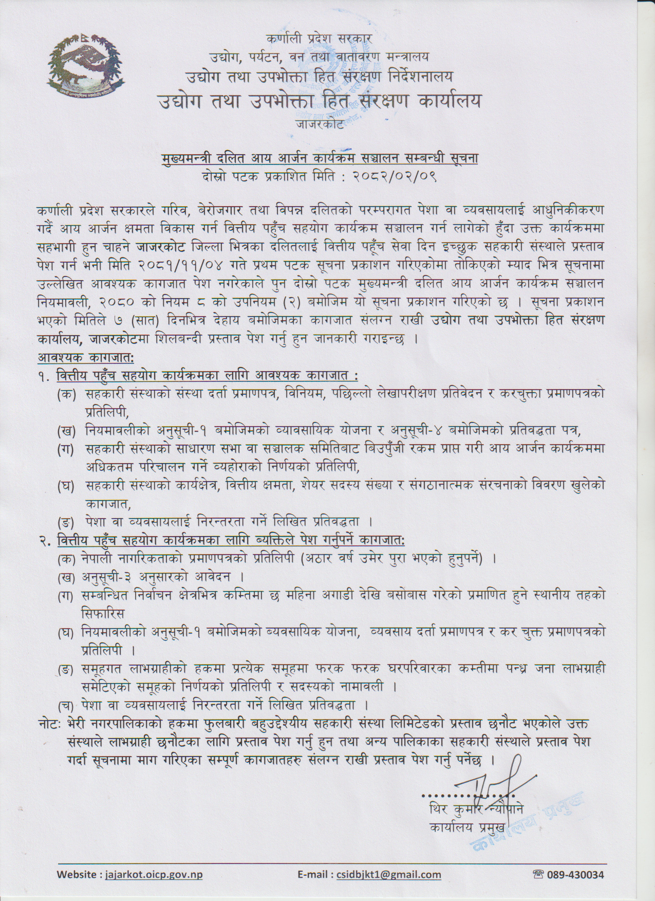 1) मुख्यमन्त्री दलित आयआर्जन कार्यक्रम सञ्चालन सम्बन्धी दोस्रो सूचना । (2082-02-09)